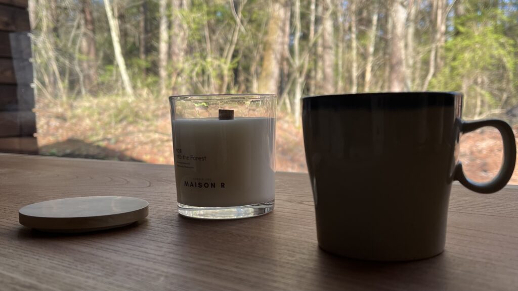 小さな焚き火のような木芯の音、自然豊かな場所や森の中に居るような植物そのままの香り、大豆由来のソイワックスの温かなオレンジ色の灯り